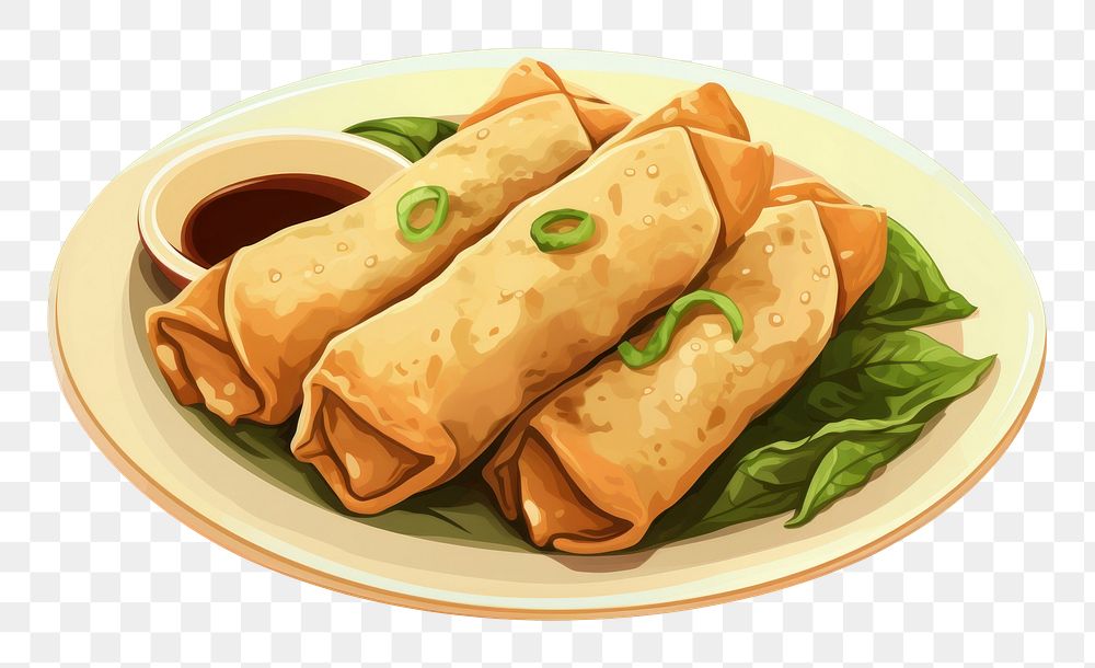 PNG Spring roll in a plate illustration food dish. https://www.rawpixel.com/image/16891347/png-spring-roll-plate-illustration-food-dishView license