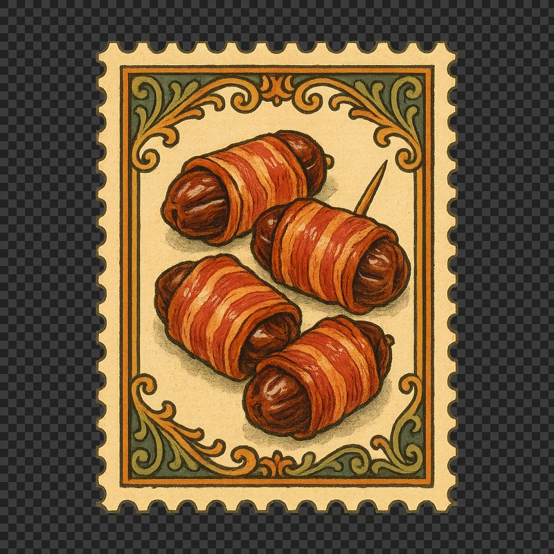 PNG Vintage illustration of bacon-wrapped sausages. https://www.rawpixel.com/image/22970183/png-vintage-illustration-bacon-wrapped-sausagesView license
