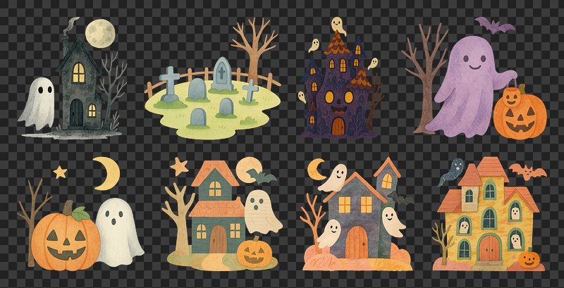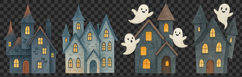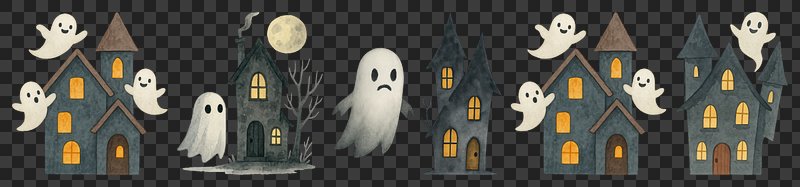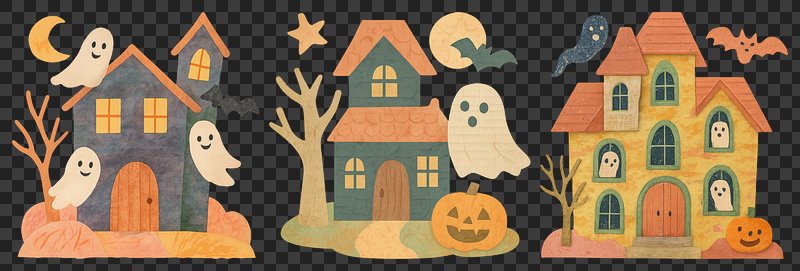 PNG Whimsical haunted houses with ghosts, element set on transparent background https://www.rawpixel.com/image/20626893/png-whimsical-haunted-houses-with-ghosts-element-set-transparent-backgroundView license