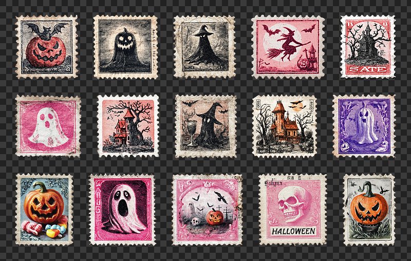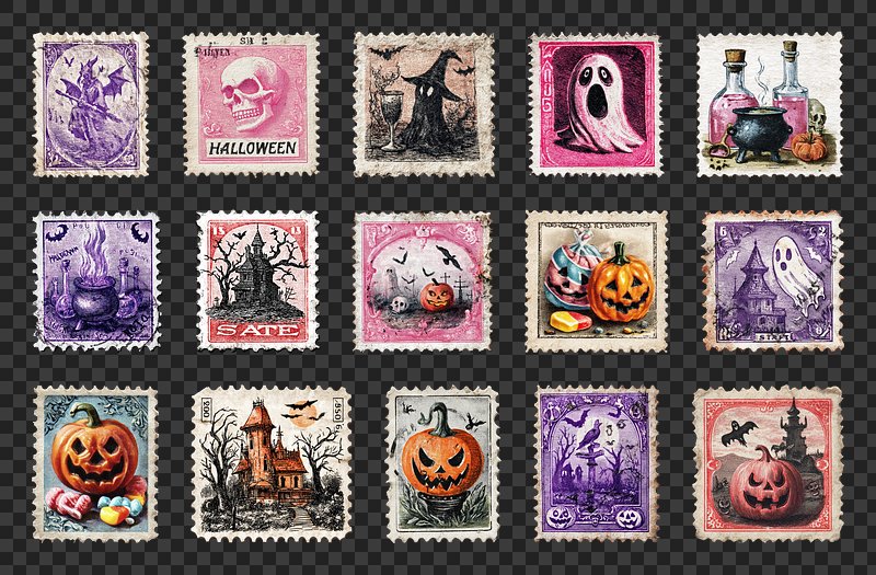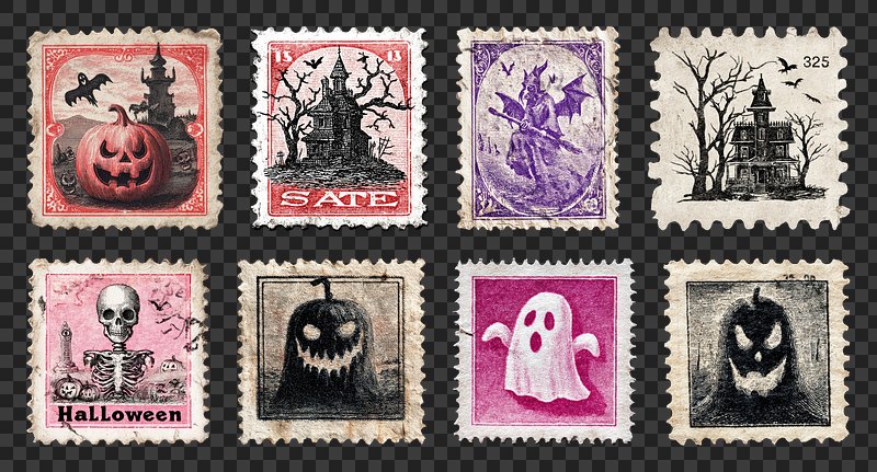 PNG Vintage Halloween-themed postage stamps, element set on transparent background https://www.rawpixel.com/image/20435880/png-paper-artView license