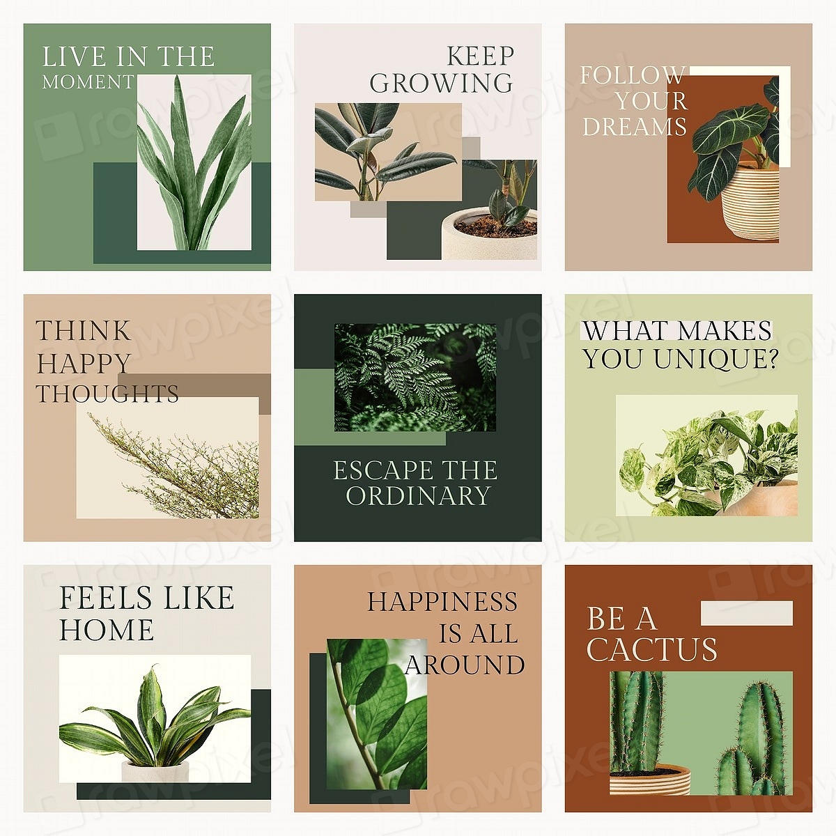 Minimal plant and eco templates with inspirational quotes. Available in Photoshop PSD and Vector EPS. All texts are editable and all images are customizable. Download to use in your own botanical projects.