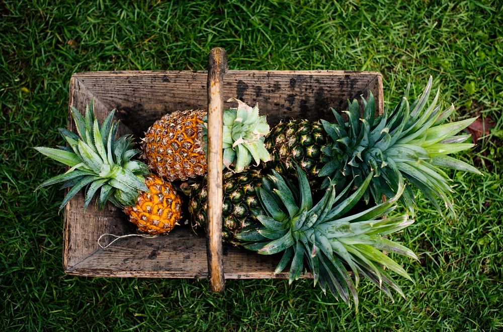 Aerial view of pineapples in wooden basket