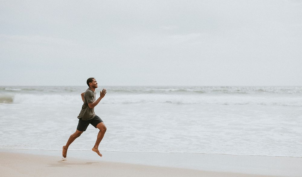 Black man running on the beach