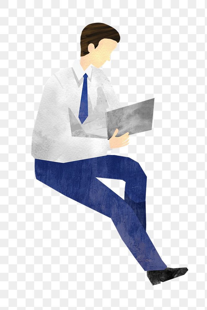 PNG Businessman using laptop, paper craft element, transparent background