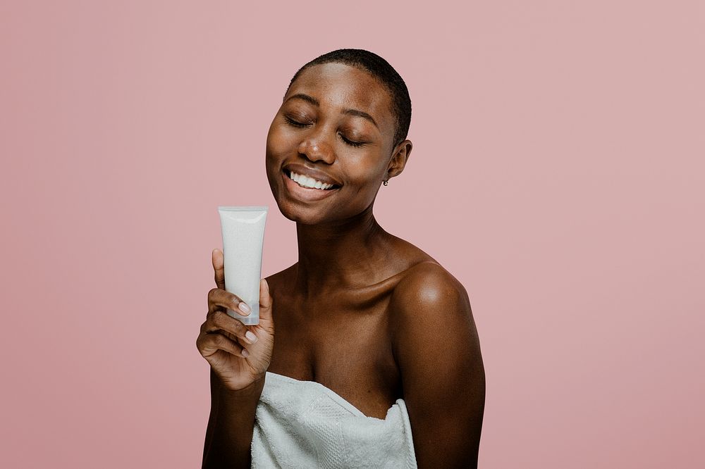 Happy black woman with a container mockup