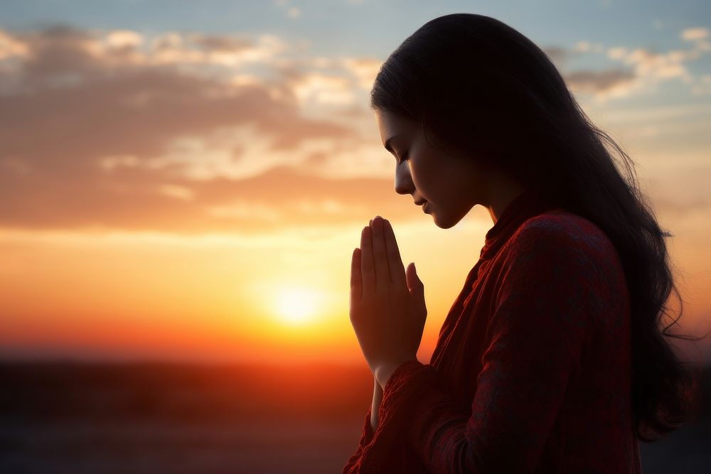 Silhouette praying sunset hand.