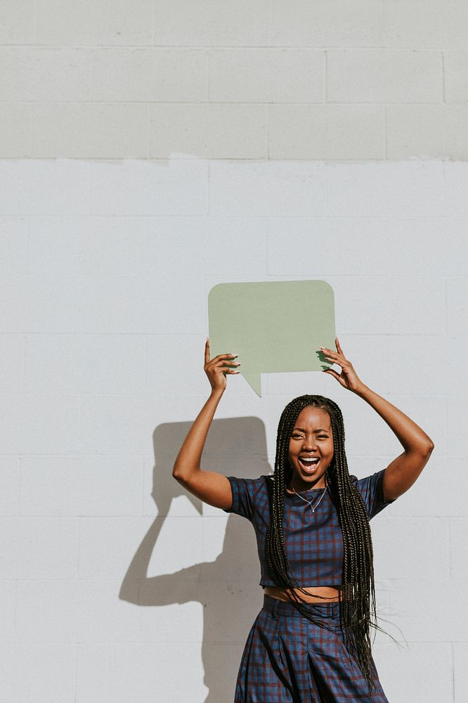 Cheerful black woman showing a blank speech bubble