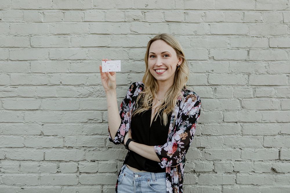 Cheerful white woman showing her business card