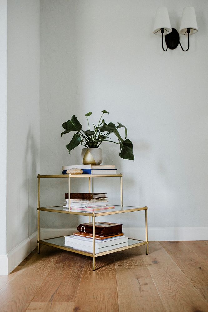 Golden shelf with books a pot of leaves