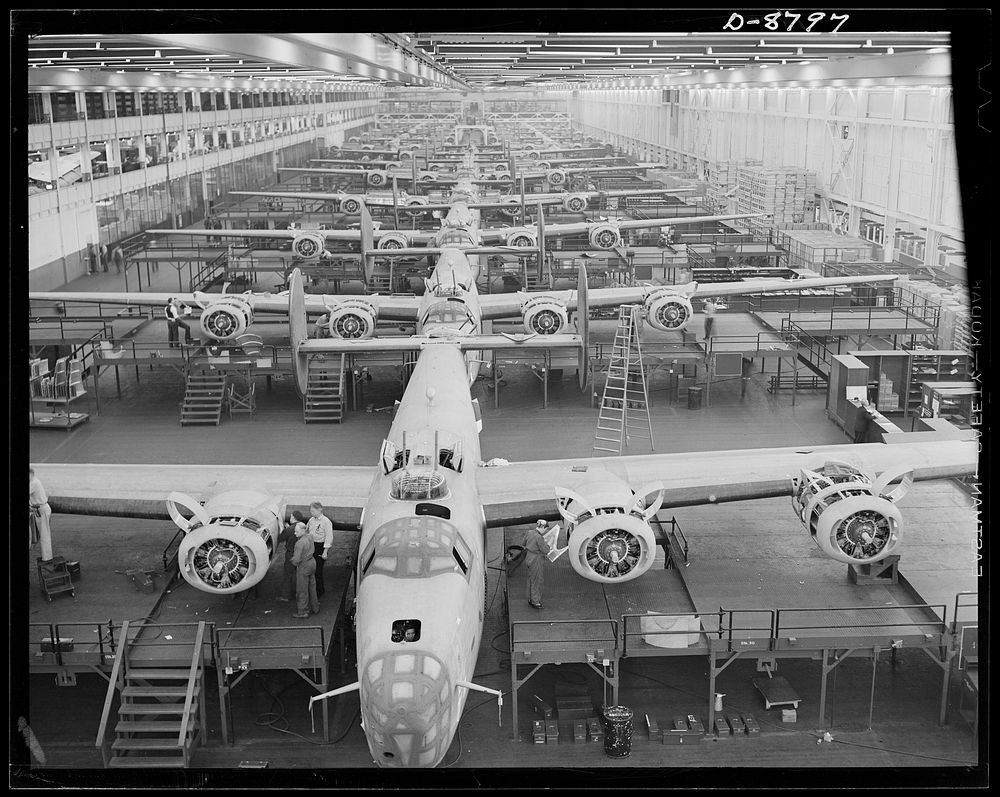 Production. B-24E (Liberator) bombers at Willow Run. Looking up one of the assembly lines at Ford's big Willow Run plant, where B-24E (Liberator) bombers are being made in great numbers. The Liberator is capable of operation at high altitudes and over great ranges on precision bombing missions. It has proved itself an excellent performer in the Pacific, in Northern Africa, Europe and the Aleutians. Ford's Willow Run Plant, Michigan. Sourced from the Library of Congress.