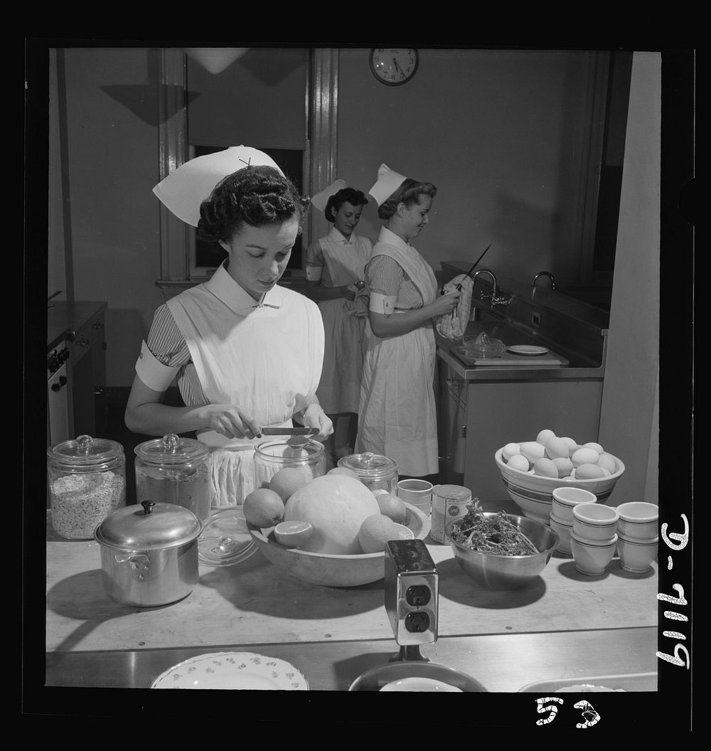 Nurse training. The why and wherefores of nutrition are mastered by student nurses during their hospital training period. Each student must spend hours in various diet kitchens, learning the intricacies of food therapy, and methods of preparing meals in accordance with their patients' prescribed diets. Sourced from the Library of Congress.