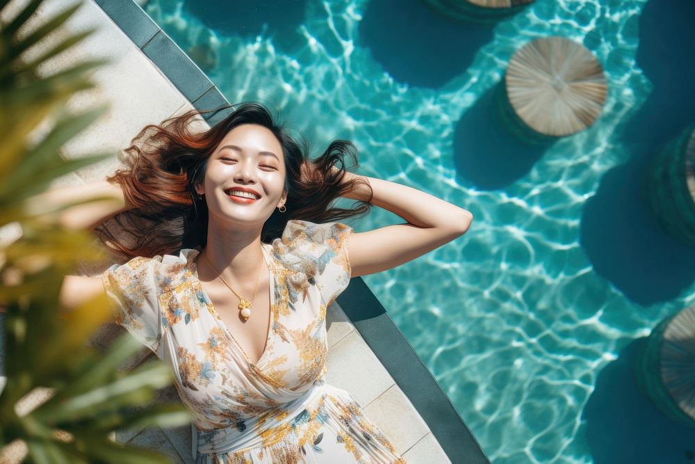 Happy woman swimming laughing cheerful.