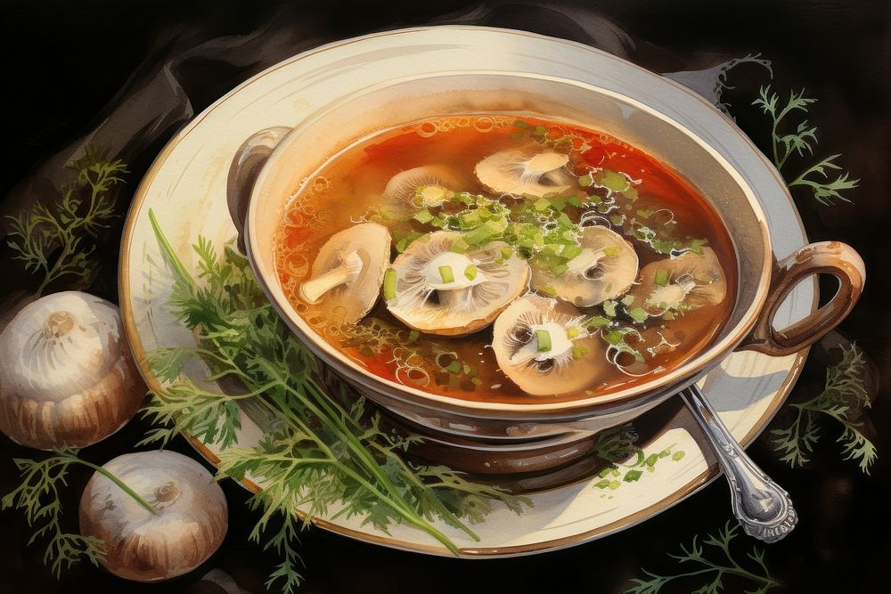 Watercolor mushroom soup seafood meal dish.