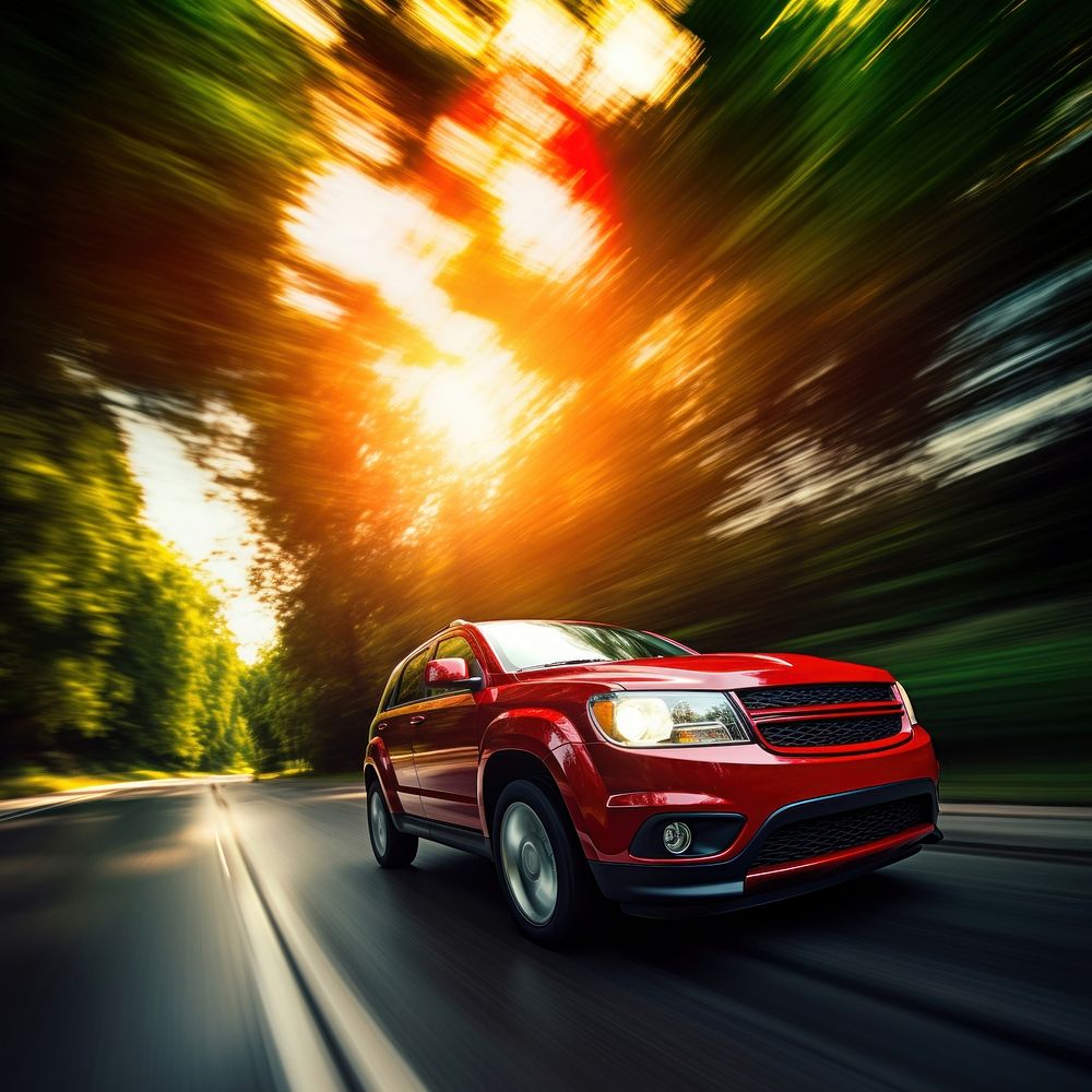 photo of red suv car in motion.