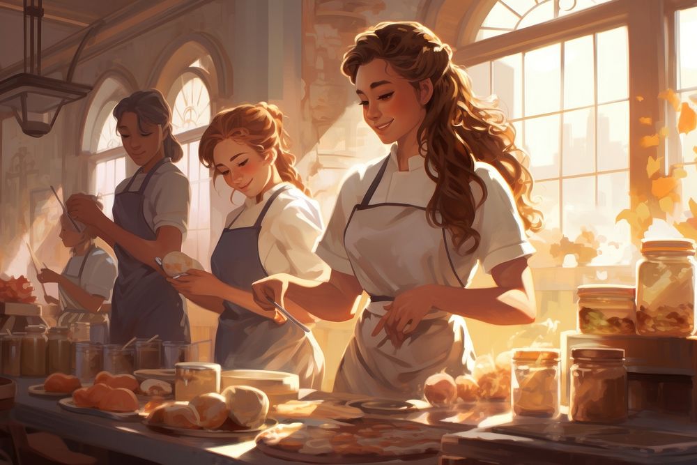 Cooking school students adult food togetherness.