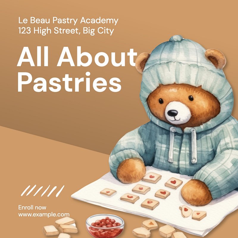 Edit TemplateTungSaveSaveEdit Templateteddy bearcookiescartoonanimalwatercolorpillillustrationbearHomemade bakery Instagram post template, editable textMorePremium designInfoEdit TemplateView personal and business licenseGet Premium from just$8 / monthExplore PremiumFree design resources and creative tools0Free foreverJoin FreeShareVideosTemplatesSimilarDelicious cookies Instagram post template, editable texthttps://www.rawpixel.com/image/12596618/delicious-cookies-instagram-post-template-editable-textView licenseHomemade bakery Instagram post templatehttps://www.rawpixel.com/image/13104240/homemade-bakery-instagram-post-templateView licenseBaked with love Instagram post template, editable texthttps://www.rawpixel.com/image/12596620/baked-with-love-instagram-post-template-editable-textView licenseHomemade bakery Instagram post template, editable texthttps://www.rawpixel.com/image/12513881/homemade-bakery-instagram-post-template-editable-textView licensePastry school Instagram post template, editable texthttps://www.rawpixel.com/image/12597047/pastry-school-instagram-post-template-editable-textView licenseHomemade bakery Instagram post template, editable texthttps://www.rawpixel.com/image/12379089/homemade-bakery-instagram-post-template-editable-textView licenseCartoon bear businessman watercolor animal character illustration, editable designhttps://www.rawpixel.com/image/12613863/image-architecture-bear-cartoonView licenseHomemade bakery Instagram post template, editable texthttps://www.rawpixel.com/image/12466576/homemade-bakery-instagram-post-template-editable-textView licenseCartoon bear baseball player watercolor animal character illustration, editable designhttps://www.rawpixel.com/image/12612951/png-art-baby-ballView licenseHomemade pastries Instagram post template, editable texthttps://www.rawpixel.com/image/11925948/homemade-pastries-instagram-post-template-editable-textView licenseCartoon bear businessmen watercolor animal character illustration, editable designhttps://www.rawpixel.com/image/12612393/image-accessory-adult-aggressionView licenseHomemade bakery Instagram post template, editable texthttps://www.rawpixel.com/image/11957719/homemade-bakery-instagram-post-template-editable-textView licenseCartoon bear businessman watercolor animal character illustration, editable designhttps://www.rawpixel.com/image/12613889/image-animal-beach-bearView licenseHomemade bakery Instagram post templatehttps://www.rawpixel.com/image/14836047/homemade-bakery-instagram-post-templateView licenseCartoon bear baseball player watercolor animal character illustration, editable designhttps://www.rawpixel.com/image/12612467/png-athlete-baseball-ballView licenseArtisan bakery Instagram post template, editable social media designhttps://www.rawpixel.com/image/9972140/artisan-bakery-instagram-post-template-editable-social-media-designView licenseCartoon bear music watercolor animal character illustration, editable designhttps://www.rawpixel.com/image/12612443/cartoon-bear-music-watercolor-animal-character-illustration-editable-designView licenseHomemade pastries Instagram post template, editable texthttps://www.rawpixel.com/image/11745769/homemade-pastries-instagram-post-template-editable-textView licenseCartoon bear businessmen watercolor animal character illustration, editable designhttps://www.rawpixel.com/image/12612266/image-accessory-adult-angerView licenseHomemade bakery Instagram post template, editable texthttps://www.rawpixel.com/image/12229627/homemade-bakery-instagram-post-template-editable-textView licenseBear ballerina, digital art editable remixhttps://www.rawpixel.com/image/12632759/bear-ballerina-digital-art-editable-remixView licenseDelicious cookies Instagram post template, editable texthttps://www.rawpixel.com/image/10629601/delicious-cookies-instagram-post-template-editable-textView licenseEditable watercolor teddy bear character design element sethttps://www.rawpixel.com/image/15259622/editable-watercolor-teddy-bear-character-design-element-setView licenseDelicious cookies Instagram post template, editable texthttps://www.rawpixel.com/image/12576889/delicious-cookies-instagram-post-template-editable-textView licenseTeddy bear with kid toys, watercolor illustration, editable remixhttps://www.rawpixel.com/image/12512795/teddy-bear-with-kid-toys-watercolor-illustration-editable-remixView licenseDelicious cookies Instagram post templatehttps://www.rawpixel.com/image/9814071/delicious-cookies-instagram-post-templateView licenseDiscover photography Instagram post template, editable texthttps://www.rawpixel.com/image/12598177/discover-photography-instagram-post-template-editable-textView licenseHomemade bakery Instagram post templatehttps://www.rawpixel.com/image/13051161/homemade-bakery-instagram-post-templateView licenseWatercolor teddy bear background, editable remixhttps://www.rawpixel.com/image/12531565/watercolor-teddy-bear-background-editable-remixView licenseBread baking guide Instagram post template, editable texthttps://www.rawpixel.com/image/11807333/bread-baking-guide-instagram-post-template-editable-textView licenseWatercolor teddy bear background, editable remixhttps://www.rawpixel.com/image/12531635/watercolor-teddy-bear-background-editable-remixView licenseHomemade pastries Instagram post template, editable texthttps://www.rawpixel.com/image/11769967/homemade-pastries-instagram-post-template-editable-textView licenseCartoon singing performance watercolor animal character illustration, editable designhttps://www.rawpixel.com/image/12612495/png-animal-representation-bear-cartoonView licenseHomemade pastries Facebook post template, editable designhttps://www.rawpixel.com/image/12654872/homemade-pastries-facebook-post-template-editable-designView licenseCute watercolor teddy bears isolated element sethttps://www.rawpixel.com/image/14993224/cute-watercolor-teddy-bears-isolated-element-setView licenseHomemade pastries Instagram post template, editable texthttps://www.rawpixel.