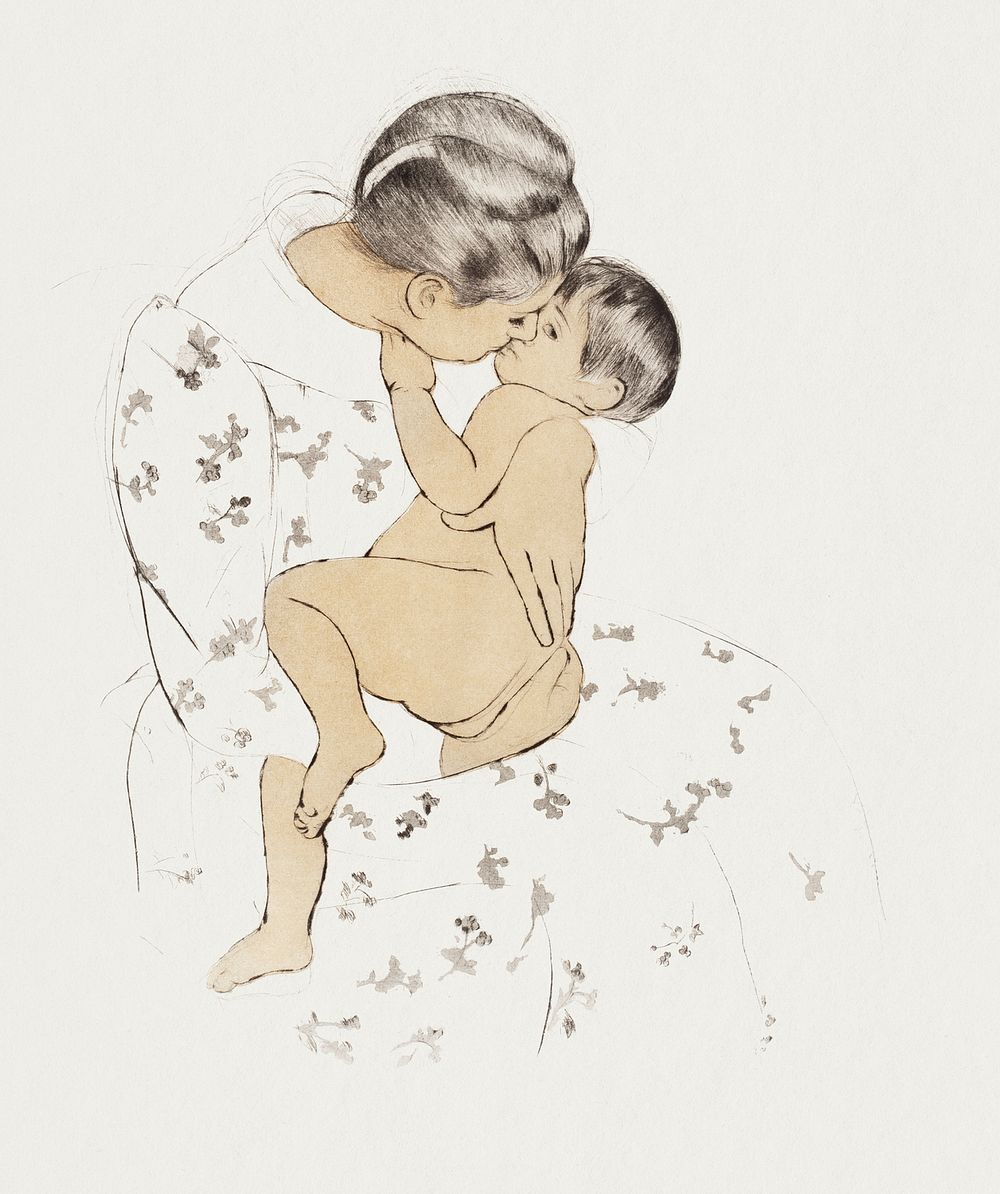 Vintage hand drawn mother kissing her child illustration, remixed from the artworks of Mary Cassatt.