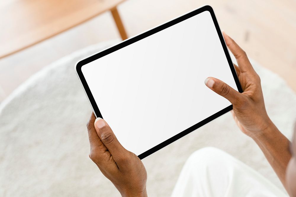 Hand holding digital tablet with blank white screen