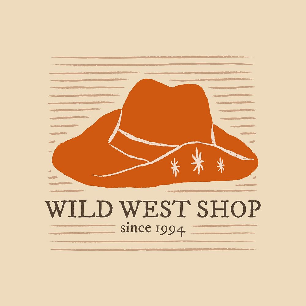 Wild west shop logo vector on beige background with cowboy hat illustration