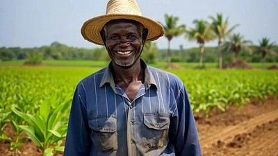 A worker at the Somali Poultry Farm in Mogadishu stands between two rows of chickens in one of the farm's chicken coops on 15 April 2018. Original public domain image from Flickr