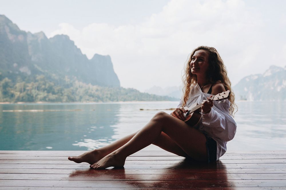 Woman playing ukulele by the water