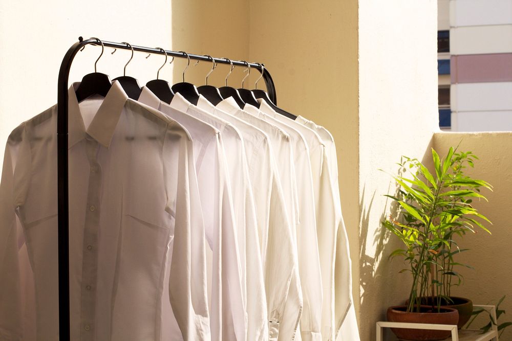 A rack of white collared shirts hangs ready for the week, free public domain CC0 image.