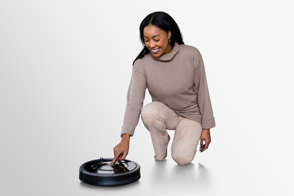 Woman using robot vacuum cleaner psd