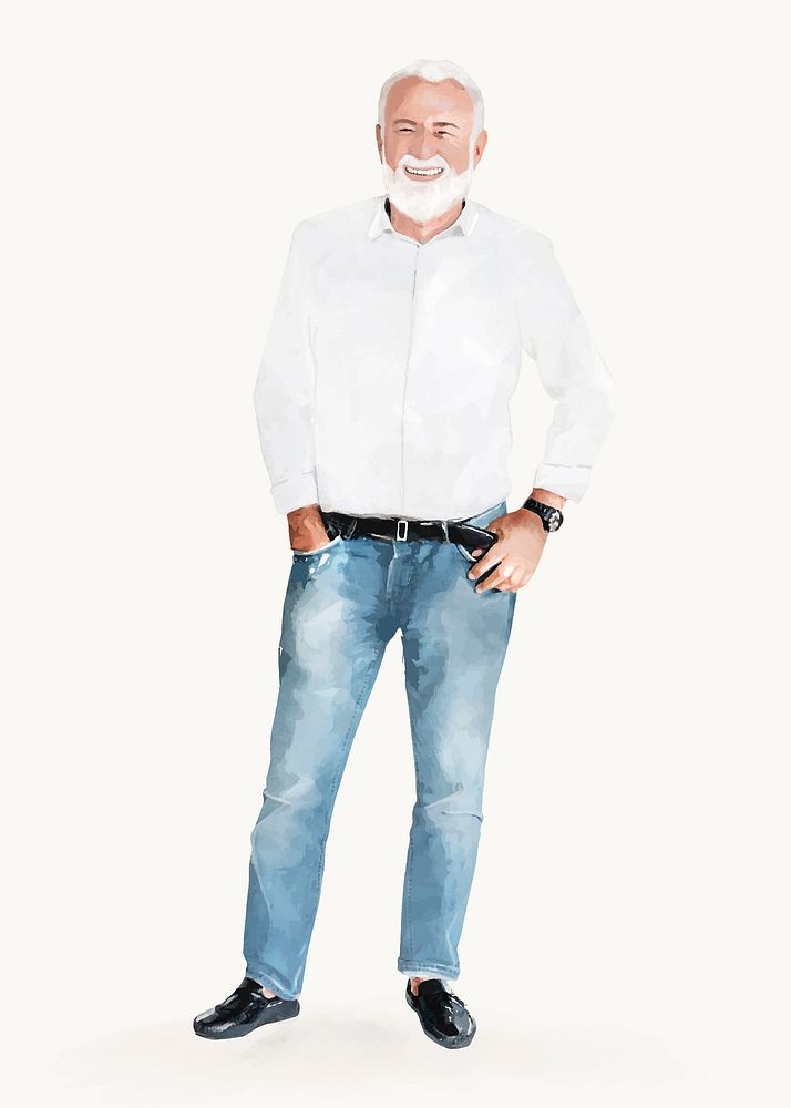 Happy senior man, casual fashion, full body watercolor illustration vector