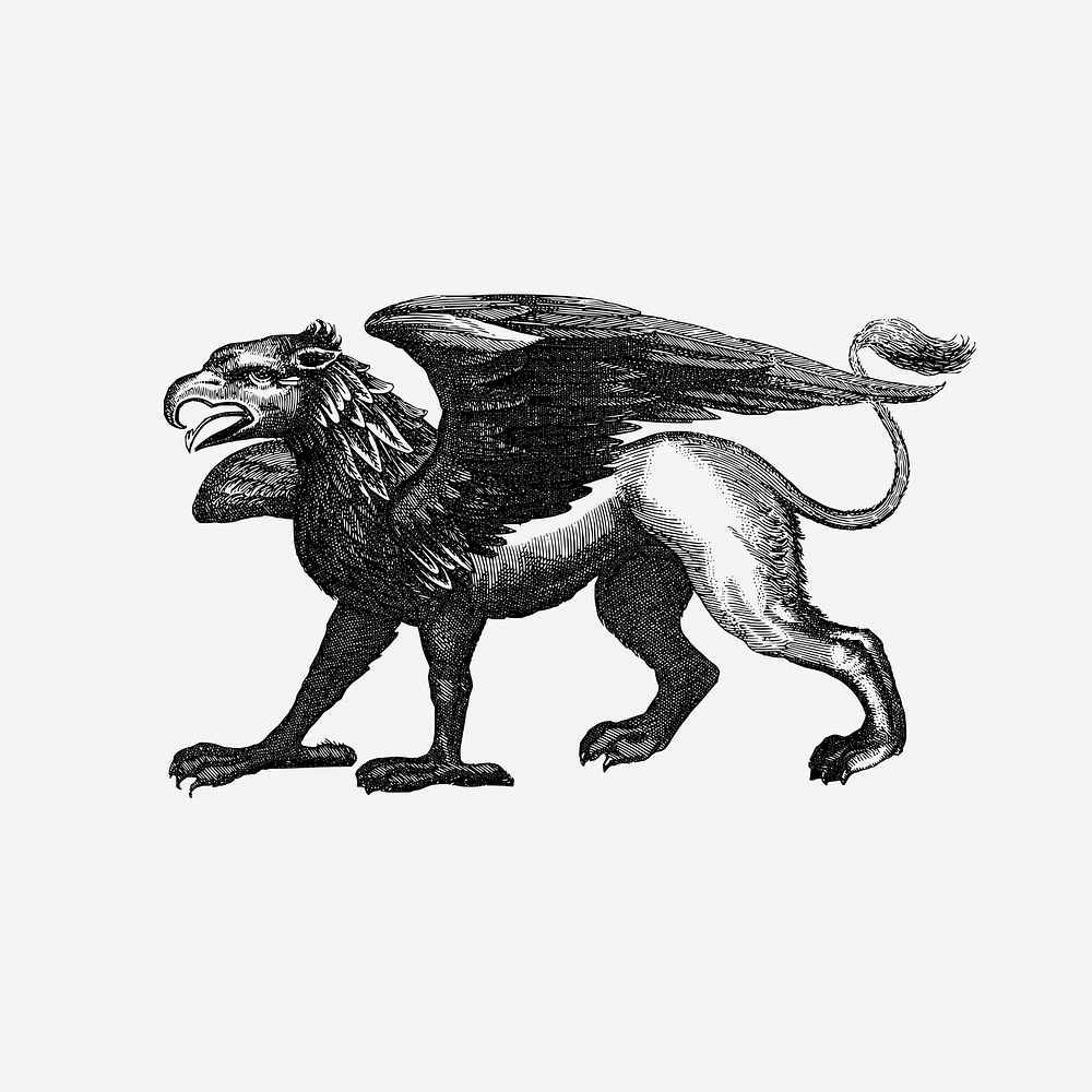 Vintage Griffin drawing, mythical creature illustration.