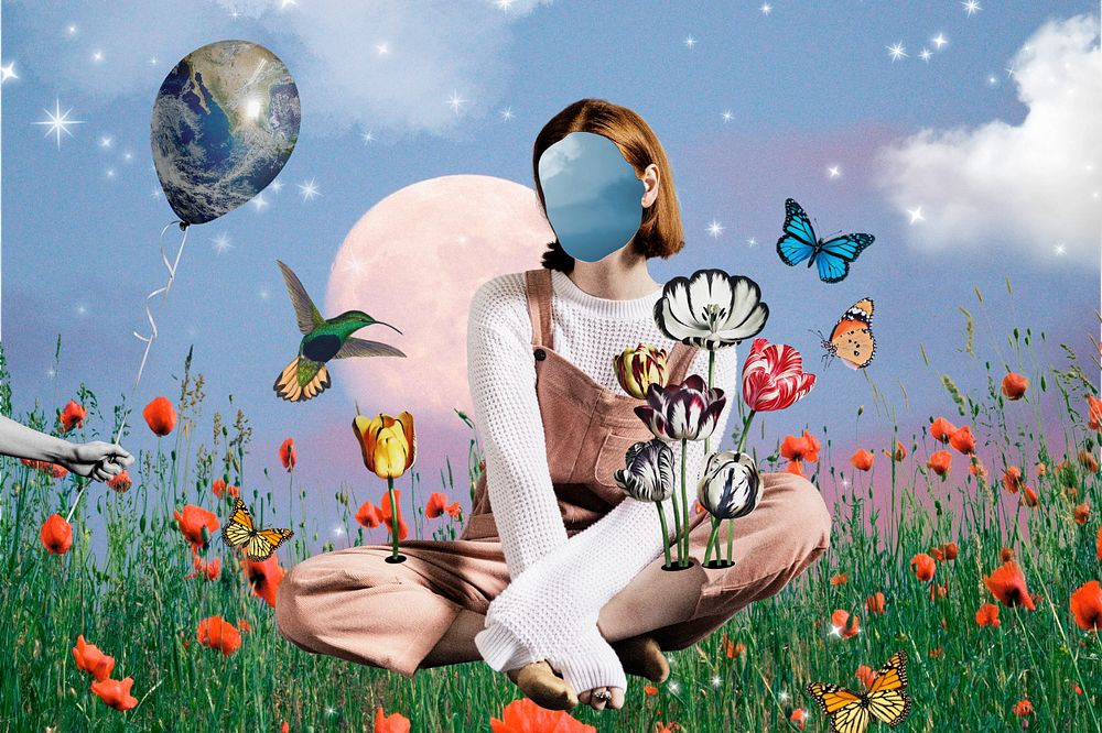 Surreal aesthetic background, faceless woman collage mixed media illustration