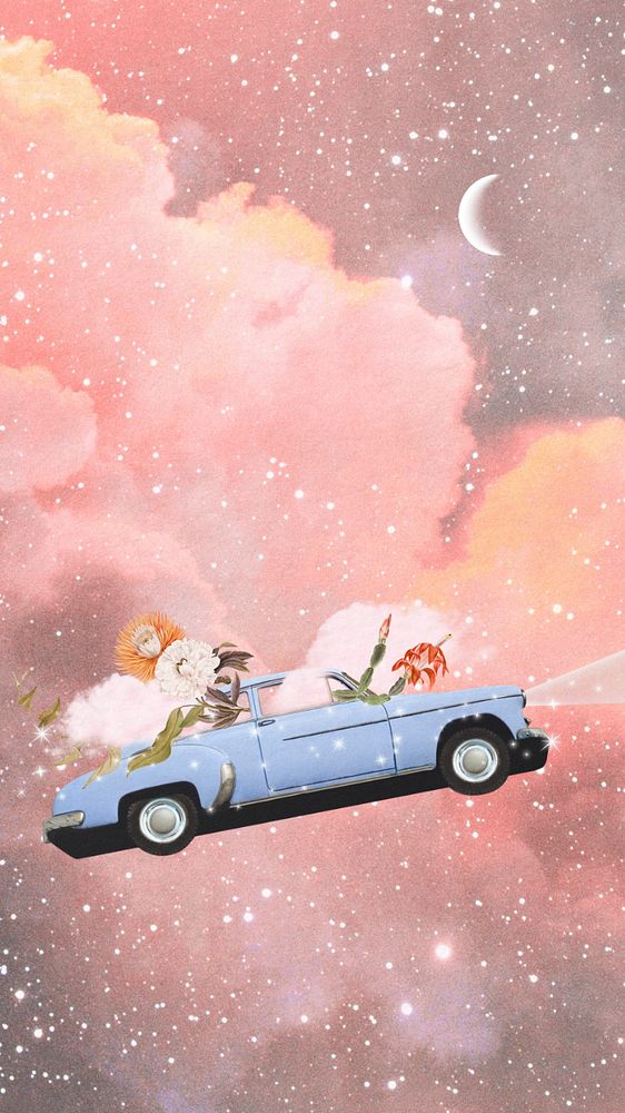 Vintage car editable mobile wallpaper, pastel bling celestial, collage art background