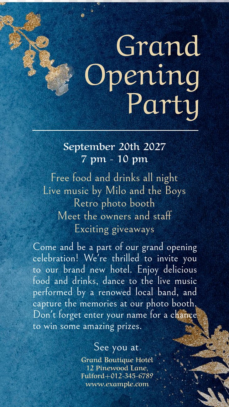 Edit TemplateWanSaveSaveEdit Templategrand openingblue gold invitationpnggoldencelebrationillustrationbluesocial mediaGrand opening Instagram post template, editable textMorePremium designInfoEdit TemplateView personal and business licenseGet Premium from just$8 / monthExplore PremiumFree design resources and creative tools0Free foreverJoin FreeShareVideosTemplatesSimilarGrand opening Instagram post template, editable texthttps://www.rawpixel.com/image/7567060/imageView licenseGrand opening Instagram post template, editable texthttps://www.rawpixel.com/image/9781722/grand-opening-instagram-post-template-editable-textView licenseGrand opening Instagram post template, editable texthttps://www.rawpixel.com/image/7551855/imageView licenseCocktail party Instagram post template, editable texthttps://www.rawpixel.com/image/7531956/imageView licenseGrand opening Instagram post template, editable texthttps://www.rawpixel.com/image/7550819/imageView licenseGrand opening promo Facebook post template, editable designhttps://www.rawpixel.com/image/12660258/grand-opening-promo-facebook-post-template-editable-designView licenseGrand opening party Instagram post template, editable texthttps://www.rawpixel.com/image/11947988/grand-opening-party-instagram-post-template-editable-textView licenseGrand opening invitation card template, editable texthttps://www.rawpixel.com/image/7535892/imageView licenseGrand opening party Instagram story template, editable texthttps://www.rawpixel.com/image/11948471/grand-opening-party-instagram-story-template-editable-textView licenseGrand opening Instagram story template, editable texthttps://www.rawpixel.com/image/11773864/grand-opening-instagram-story-template-editable-textView licenseGrand opening party Instagram story template, editable texthttps://www.rawpixel.com/image/11905714/grand-opening-party-instagram-story-template-editable-textView licenseGrand opening invitation card template, editable designhttps://www.rawpixel.com/image/7536135/imageView licenseGala night Instagram post template, editable texthttps://www.rawpixel.com/image/11732152/gala-night-instagram-post-template-editable-textView licenseOpening night Instagram post templatehttps://www.rawpixel.com/image/9619889/opening-night-instagram-post-templateView licenseGrand opening party Instagram post template, editable texthttps://www.rawpixel.com/image/11905687/grand-opening-party-instagram-post-template-editable-textView licenseLounge opening Instagram post template, editable texthttps://www.rawpixel.com/image/12477945/lounge-opening-instagram-post-template-editable-textView licenseGala night Instagram story template, editable texthttps://www.rawpixel.com/image/11732160/gala-night-instagram-story-template-editable-textView licenseHen night celebration Instagram post template, editable texthttps://www.rawpixel.com/image/12478819/hen-night-celebration-instagram-post-template-editable-textView licenseHiring Instagram story templatehttps://www.rawpixel.com/image/14770692/hiring-instagram-story-templateView licenseParty invitation Facebook post template, editable social media adhttps://www.rawpixel.com/image/9266779/party-invitation-facebook-post-template-editable-social-mediaView licenseSoft opening Instagram post template, editable texthttps://www.rawpixel.com/image/11704935/soft-opening-instagram-post-template-editable-textView licenseLet's celebrate! post template, editable text for social mediahttps://www.rawpixel.com/image/10091688/lets-celebrate-post-template-editable-text-for-social-mediaView licenseSoft opening Instagram post templatehttps://www.rawpixel.com/image/14771573/soft-opening-instagram-post-templateView licenseLet's drink Facebook post templatehttps://www.rawpixel.com/image/14437886/lets-drink-facebook-post-templateView licenseGrand opening social story template, editable texthttps://www.rawpixel.com/image/11758423/grand-opening-social-story-template-editable-textView licenseLet's party Instagram post templatehttps://www.rawpixel.com/image/13127265/lets-party-instagram-post-templateView licenseLaunch party Instagram post template, editable designhttps://www.rawpixel.com/image/9587154/launch-party-instagram-post-template-editable-designView licenseParty night Instagram post template, editable texthttps://www.rawpixel.com/image/11552280/party-night-instagram-post-template-editable-textView licenseGrand opening Instagram post template, editable texthttps://www.rawpixel.com/image/10110227/grand-opening-instagram-post-template-editable-textView licenseChampagne night Facebook post template, editable designhttps://www.rawpixel.com/image/11631610/champagne-night-facebook-post-template-editable-designView licenseSoft opening Instagram story templatehttps://www.rawpixel.com/image/14771574/soft-opening-instagram-story-templateView licenseChampagne night Instagram post template, editable texthttps://www.rawpixel.com/image/9597328/champagne-night-instagram-post-template-editable-textView licenseGrand opening invitation template, editable designhttps://www.rawpixel.com/image/14889636/grand-opening-invitation-template-editable-designView licenseBirthday party Instagram post template, editable texthttps://www.rawpixel.com/image/11483737/birthday-party-instagram-post-template-editable-textView licenseLaunch party Instagram story template, editable texthttps://www.rawpixel.com/image/11372544/launch-party-instagram-story-template-editable-textView licenseGrand opening Instagram post template, editable texthttps://www.rawpixel.com/image/7565777/imageView licenseGrand opening Instagram story template, editable texthttps://www.rawpixel.com/image/11848236/grand-opening-instagram-story-template-editable-textView licenseGrand opening poster template, editable text and designhttps://www.rawpixel.com/image/11773861/grand-opening-poster-template-editable-text-and-designView licenseGrand opening Instagram post template, editable texthttps://www.rawpixel.com/image/11745199/grand-opening-instagram-post-template-editable-t