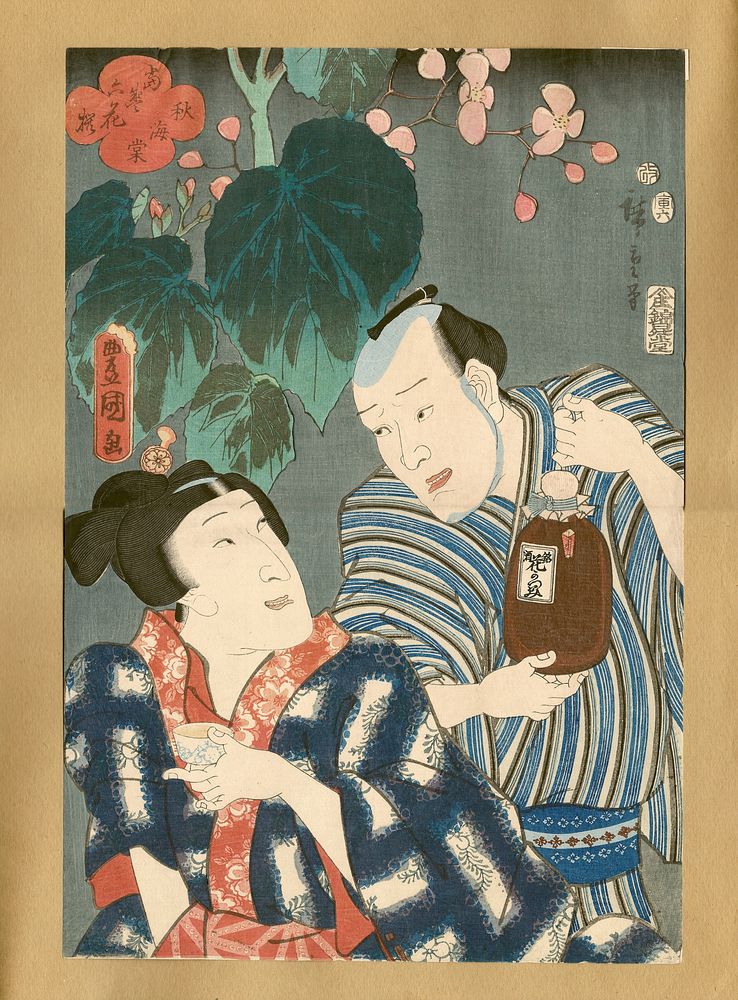 Onnagata at LL with blue, red, white kimono holds a wine cup in PL hand, looking up at a man holding a wine jug in his hands; the men exchange gaze; in background, a blossoming begonia. Original from the Minneapolis Institute of Art.