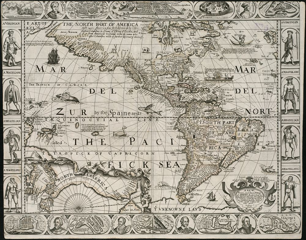 A new, plaine, and exact map of America : described by N.I. Visscher, and don into English, enlarged, and corrected, according to I. Blaeu, with the habits of the countries, and the manner of the cheife citties, the like never before