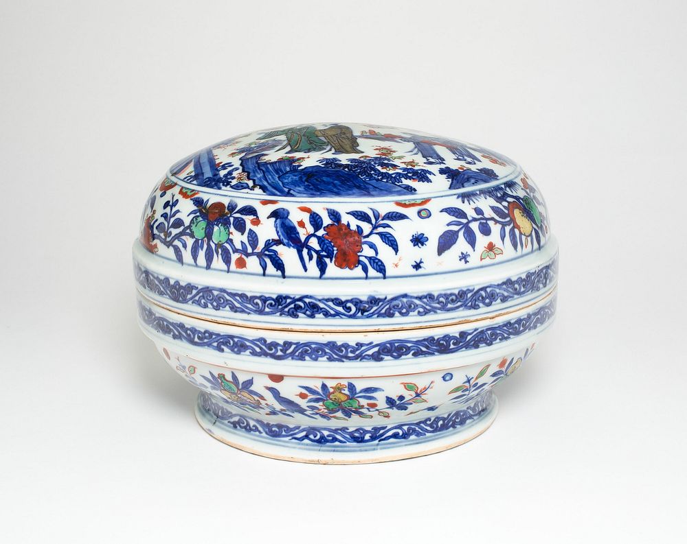 Covered Box with Scholars in a Garden Encricled by Birds, Fruits, and Flowers