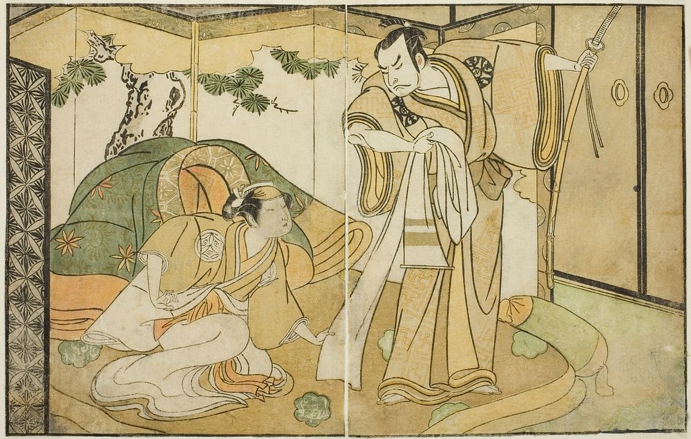 The Actors Nakamura Nakazo I as Taira no Kiyomori (right), and Yamashita Kinsaku II as Tokiwa Gozen (left), in the Play Nue no Mori Ichiyo no Mato, Performed at the Nakamura Theater in the Eleventh Month, 1770 by Katsukawa Shunsho