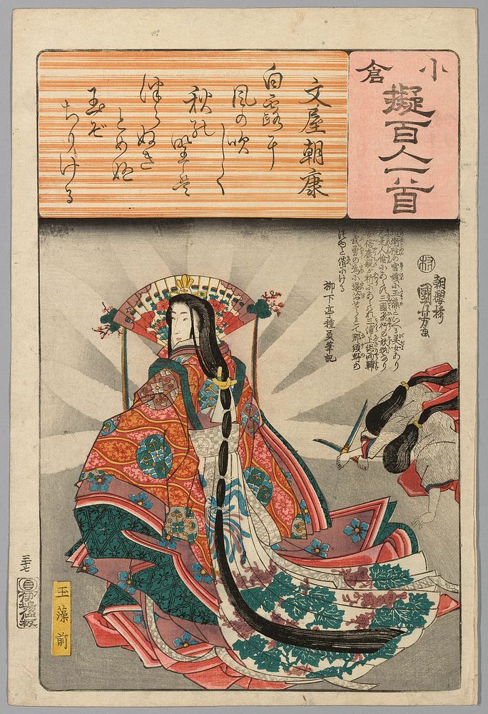 Tamomo no Mae, with Poem by Fumiya Asayasu, from the series "Ogura Versions of the One Hundred Poets (Ogura nazorae Hyakunin isshu)" by Utagawa Kuniyoshi
