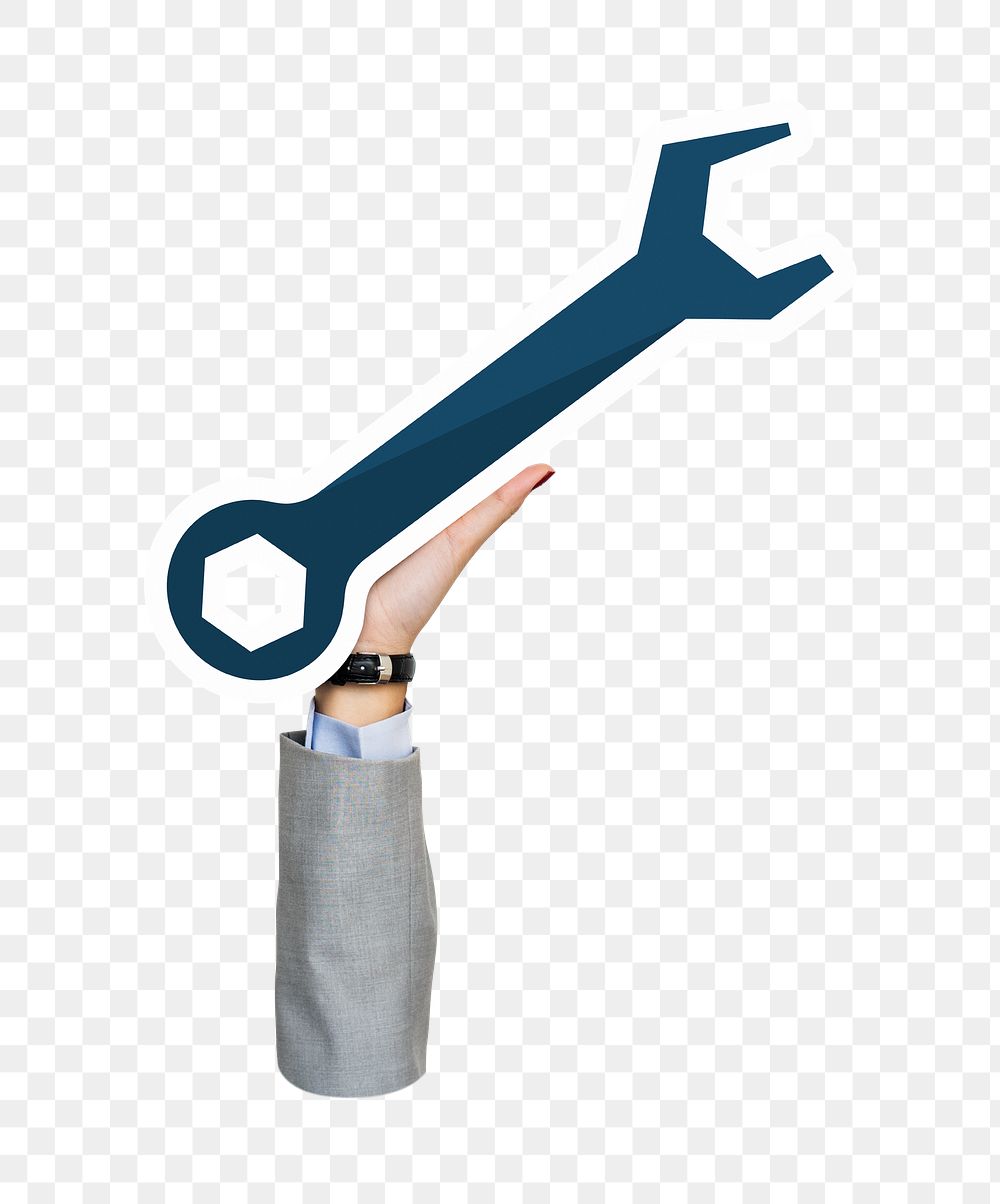Hand holding png wrench tool sticker, transparent background