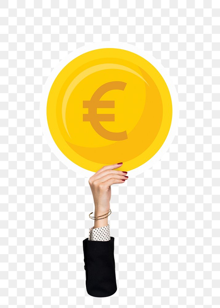 Hand holding png EURO coin clipart, transparent background