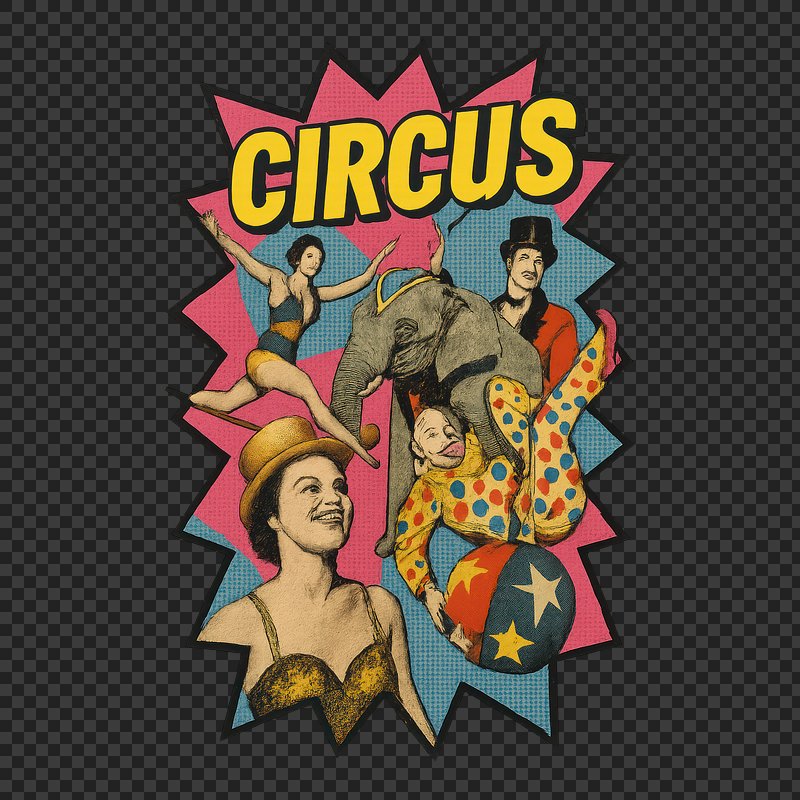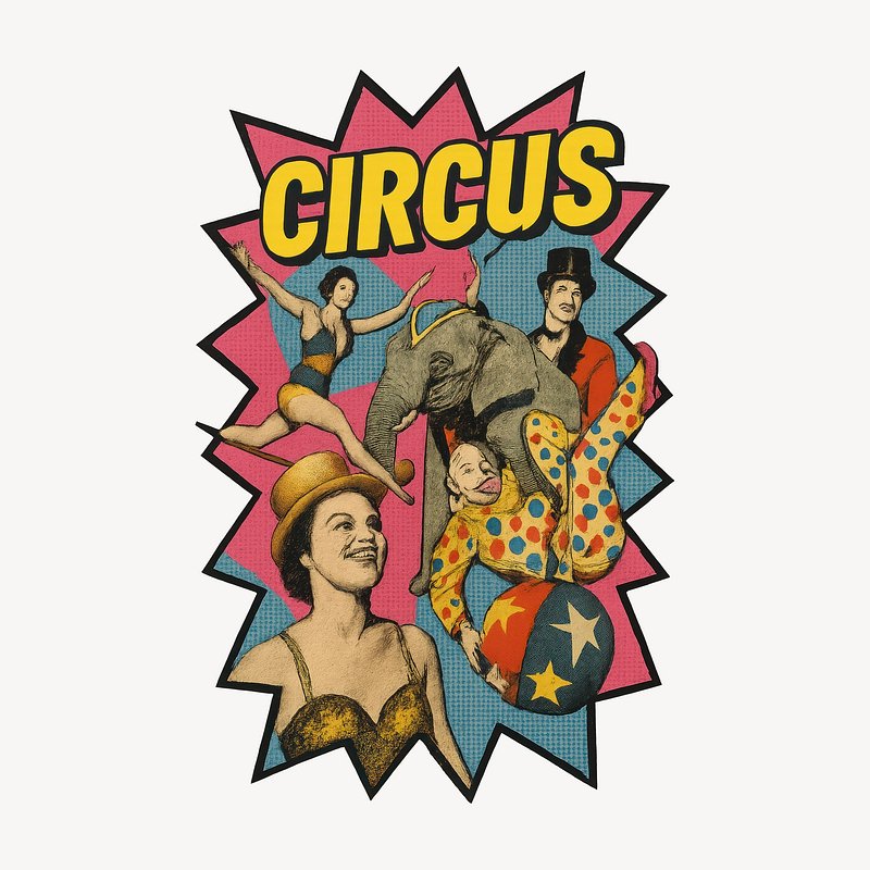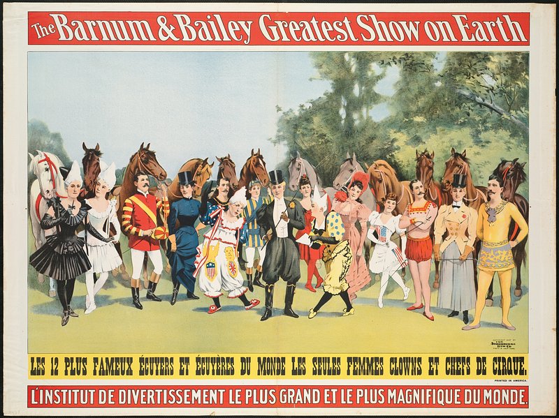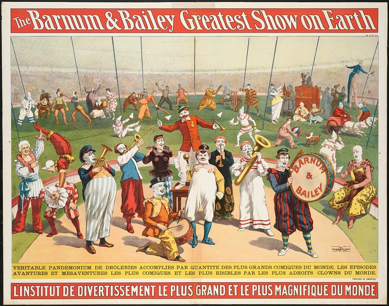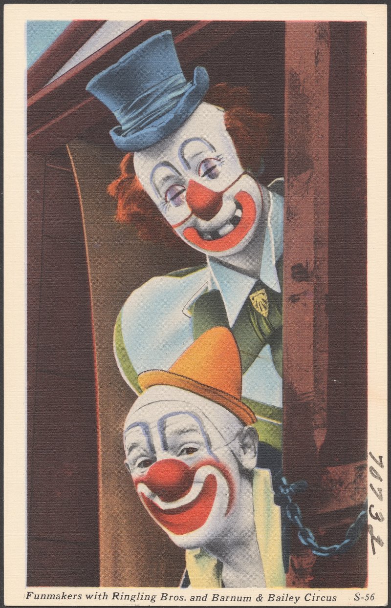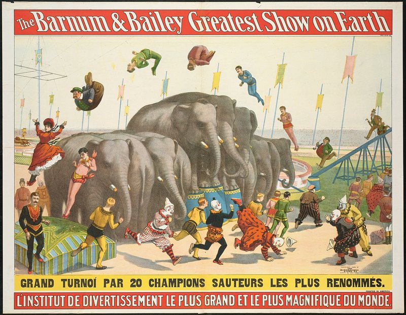 "Circus Procession" 1888 artwork showing two elephants in human clothing, one of whom rides a tricycle, a clown, and 3 uniformed marching men.Here is something very funny.Surely worth the entrance money:At the sight, the laugher peals!'Tis an elephant on wheels!Close behind him a relation,In a state of perspiration,Dons his specs, and wields his fan,Just like any gentleman.