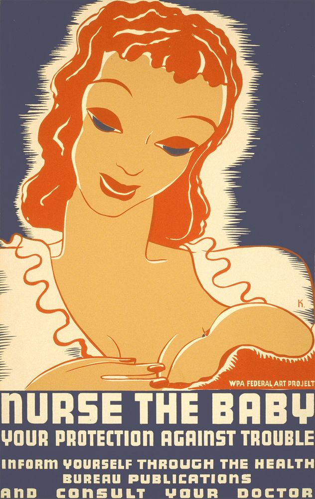 Poster promoting breast feeding and proper child care, showing mother nursing baby. Text reads: "Nurse the baby: your protection against trouble. Inform yourself through the Health Bureau publications and consult your doctor." by Erik Hans Krause.