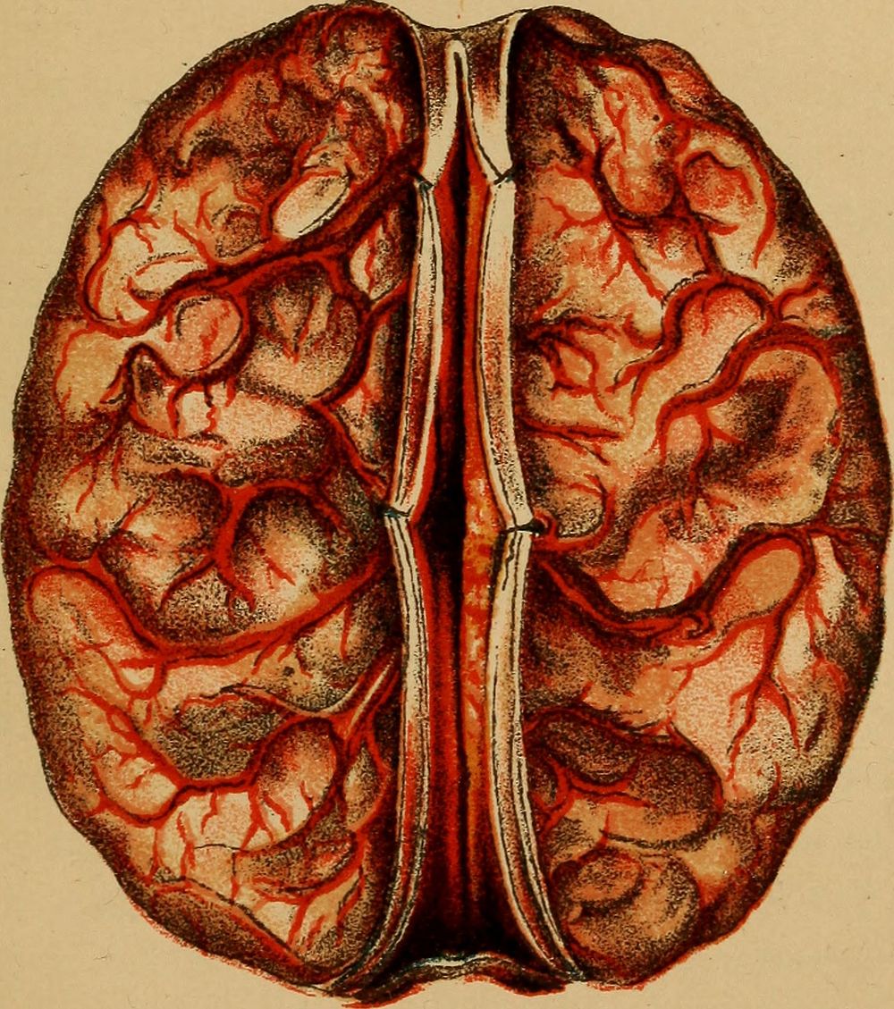 Effects of Alcohol upon the brain of a boy seventeen years of age. The whole organ and its membranes and vessels were affected. He commenced to drink when he was only twelve years of age.Identifier: eclecticguidetoh00brow (find matches)Title: The eclectic guide to health; or, Physiology and hygiene ..Year: 1887 (1880s)Authors: (Brown, Eli F.) (from old catalog)Subjects: Physiology HygienePublisher: Cincinnati, New York, Van Antwerp, Bragg & coContributing Library: The Library of CongressDigitizing Sponsor: The Library of CongressView Book Page: Book ViewerAbout This Book: Catalog EntryView All Images: All Images From BookClick here to view book online to see this illustration in context in a browseable online version of this book.Text Appearing Before Image:Normal Brain. All Convolutions Sound,Text Appearing After Image:Effects of Alcohol upon the brain of a boy seventeen years of age. The whole or-gan AND ITS MEMBRANES AND VESSELS WERE AFFECTED. He COMMENCED TO DRINK WHEN HE WASONLY TWELVE YEARS OF AGE. 124 THE NERVOUS SYSTEM. 125 dren. The children of parents who use alcohol and othernarcotics generally suffer some kind of nervous weaknesstherefrom. Intoxication is temporary insanity. It is not surprisingthat many repetitions of intoxication frequently lead topermanent forms of insanity. The use of alcohol is oneof the chief causes of insanity. Tobacco, like alcohol, is a poison. When chewed orsmoked, its poisonous portion is absorbed by the blood andcirculated through the system. Its effects are most fullyshown in injury to the blood itself, and in paralysis ofnervous force. Its influence on the nervous and muscularsystems is so powerful that its use in medicine is regardedas too dangerous for general practice. Its use causesdiseased conditions of the vital organs. The stomach, theliver, the heartNote About ImagesPlease note that these images are extracted from scanned page images that may have been digitally enhanced for readability - coloration and appearance of these illustrations may not perfectly resemble the original work.