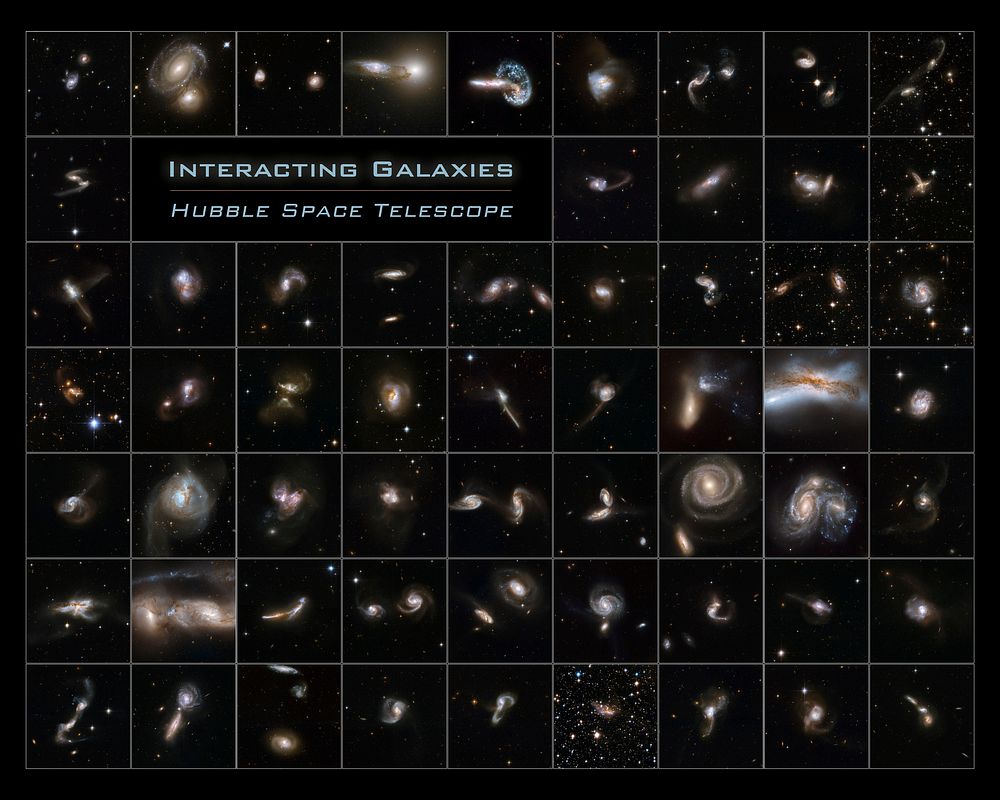 Astronomy textbooks typically present galaxies as staid, solitary, and majestic island worlds of glittering stars. But galaxies have a dynamical side. They have close encounters that sometimes end in grand mergers and overflowing sites of new star birth as the colliding galaxies morph into wondrous new shapes. Today, in celebration of the Hubble Space Telescope's 18th launch anniversary, this poster with 59 views of colliding galaxies constitute the largest collection of Hubble images ever released to the public. This new Hubble atlas dramatically illustrates how galaxy collisions produce a remarkable variety of intricate structures in never-before-seen detail.