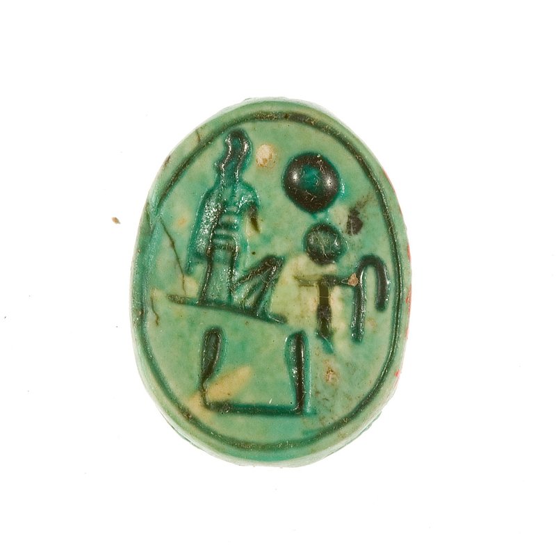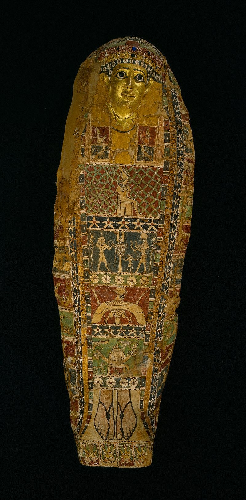 Mummification preserved mortal remains in order to house the Ka, or life force of the individual, as it needed to return to the body to find sustenance. The human-shaped covering, called "cartonnage," is composed of layers of linen and plaster. Its painted decoration includes the floral wreath on the wig, a broad collar, and a winged scarab beetle. Five additional registers of decoration show the protective four sons of Horus, the sacred boat of the funerary-deity Sokar, a mummy of Osiris on a funerary bed, a divine falcon god, and a short hieroglyphic text with an offering formula. See the additional media for a facial reconstruction of the mummy, courtesy of Michael Brassell, as well as a color reconstruction of the cartonnage.