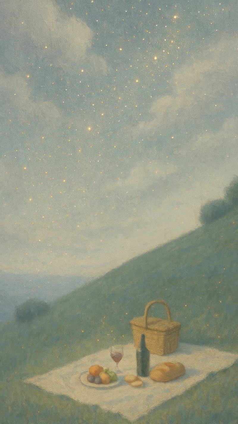 Starry night picnic scene with a basket, wine, and food on a grassy hill mobile wallpaper https://www.rawpixel.com/image/19495543/image-wallpaper-iphone-mobileView license