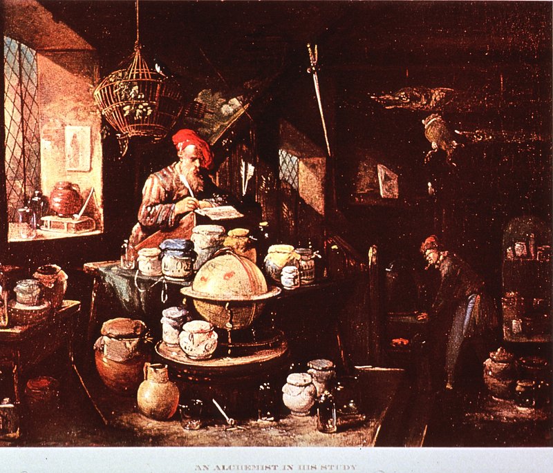 An alchemist at his furnace, hunched over bellows. Coloured mezzotint by H. Dawe after D. Teniers the younger. https://www.rawpixel.com/image/13953355/image-face-person-artFree Image from public domain license
