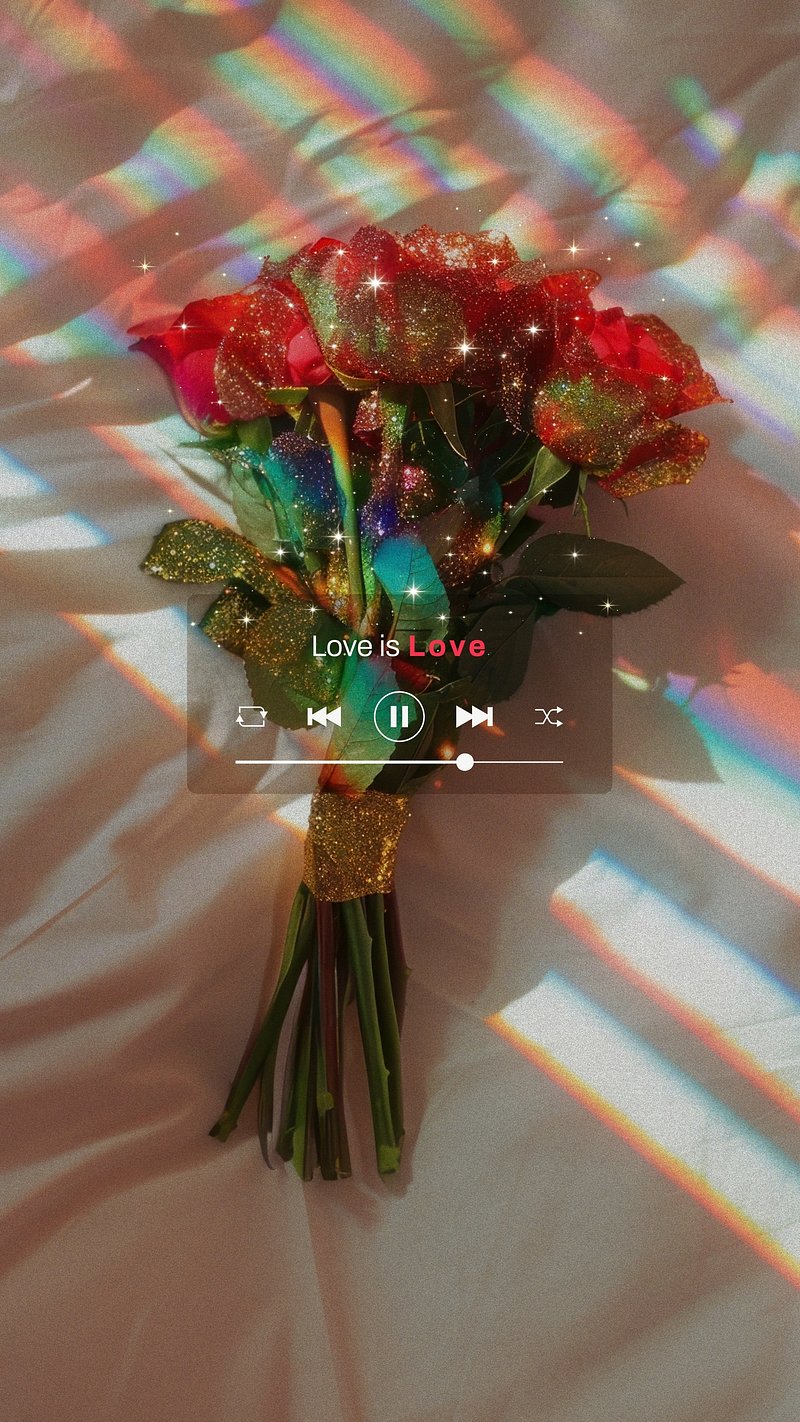 A bouquet of red roses with glitter, reflecting rainbow light. Text overlay reads 'Love is Love' with music player icons.… https://www.rawpixel.com/image/18305158/image-wallpaper-mobile-pngView license