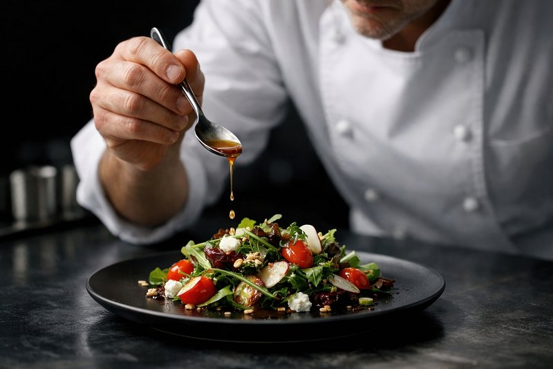 Chef garnishing gourmet salad artfully. https://www.rawpixel.com/image/25733451/chef-garnishing-gourmet-salad-artfullyView license