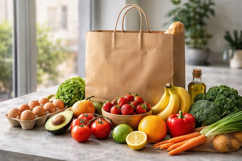 Grocery bag illustration with essentials. https://www.rawpixel.com/image/24715166/grocery-bag-illustration-with-essentialsView license