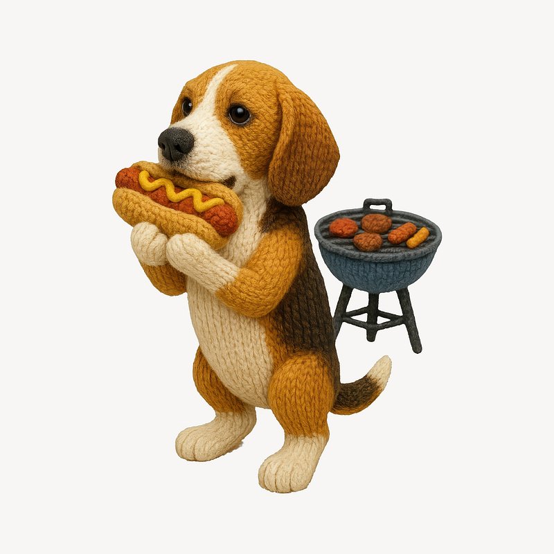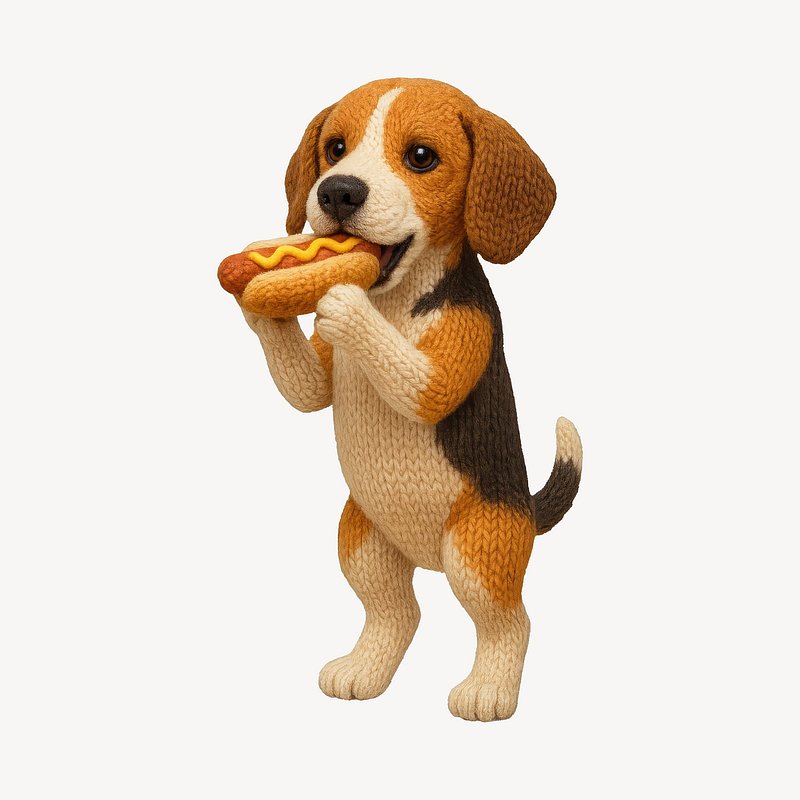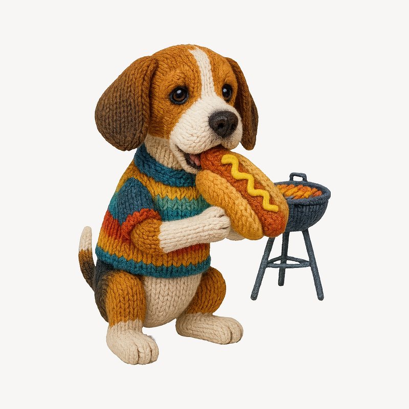 Cute knitted dog eating hotdog. https://www.rawpixel.com/image/24535536/cute-knitted-dog-eating-hotdogView license